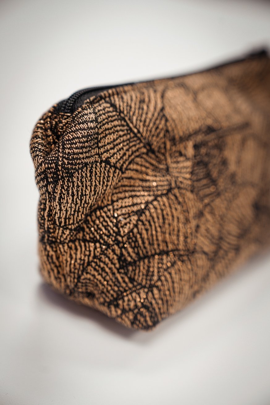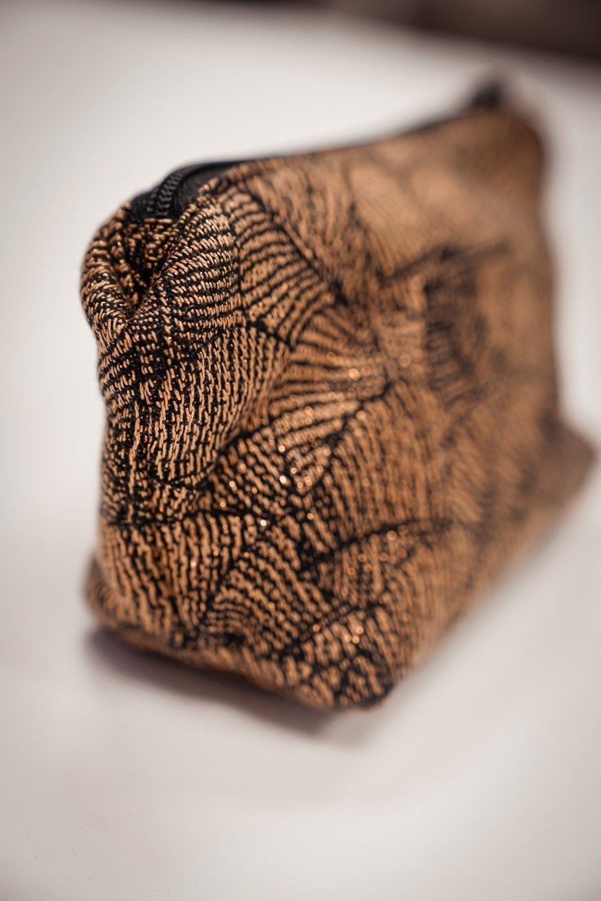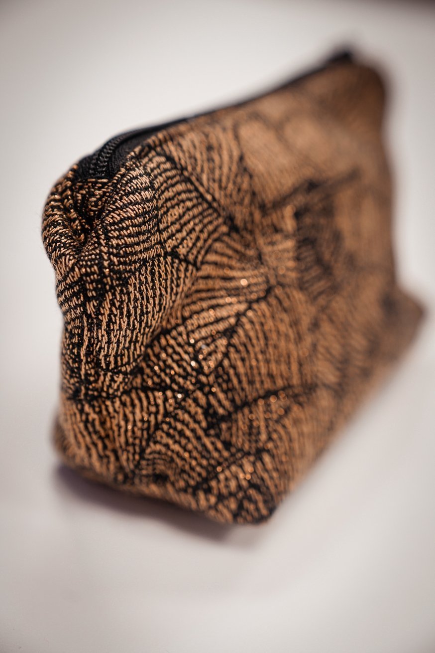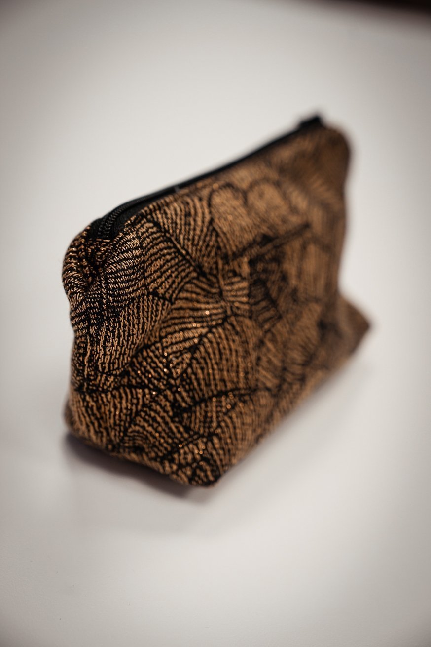 De KOKADI Cosmetisch tasje - uiteraard gemaakt van draagdoekstof. Betoverende veren, op een magische gouden achtergrond. Ons Leaves Lynne-ontwerp boeit echt iedereen.