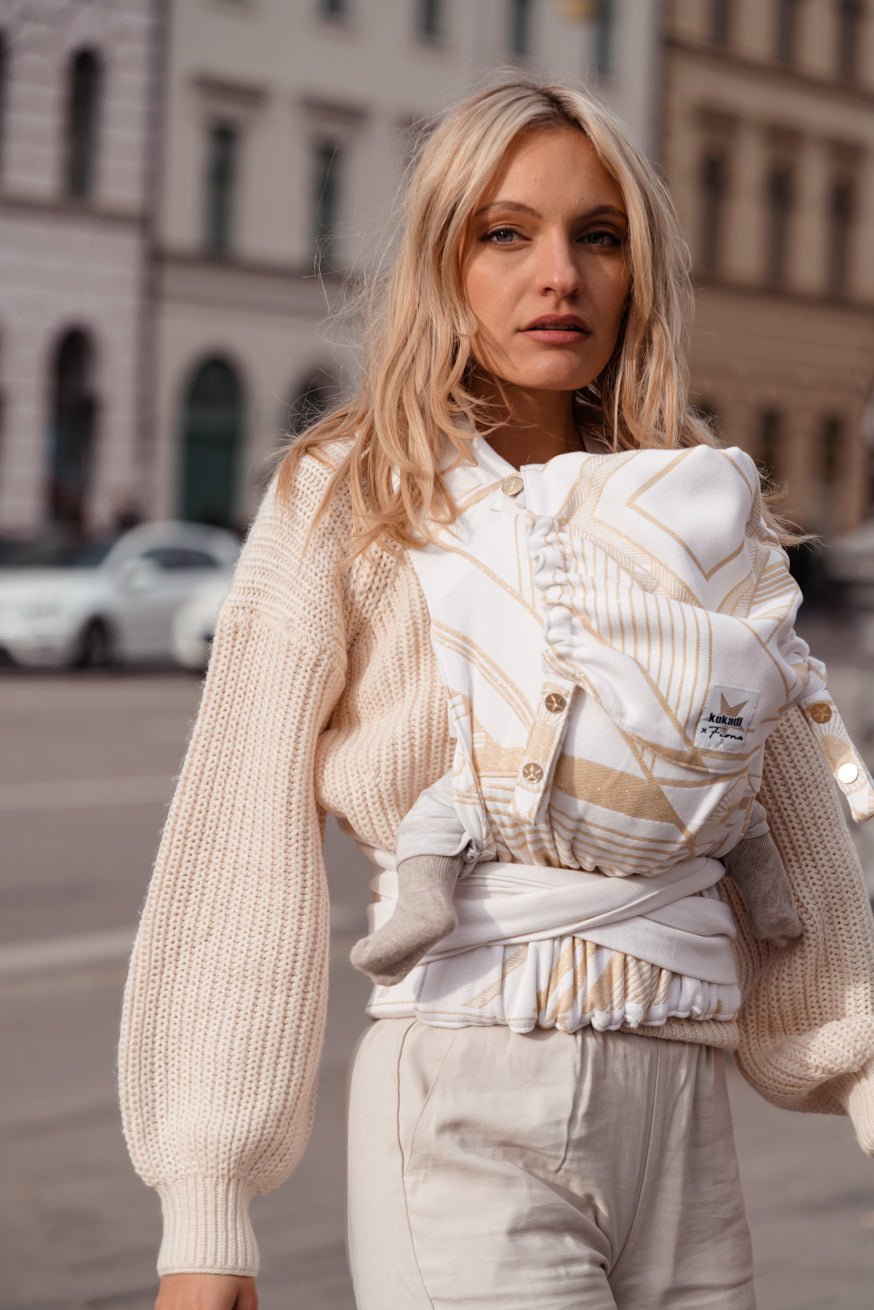 Verschillende geometrische vormen zijn geweven met gouden glittergaren en de perfect gecoördineerde roomwitte basistoon maken deze babydrager een absolute oogvanger.