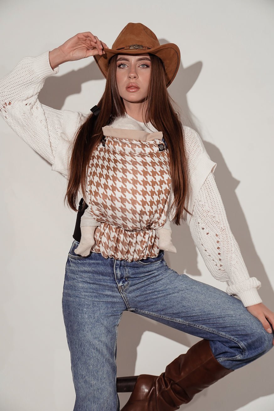 Das markante Houndstooth-Muster in warmen Latte-Macchiato-Tönen trifft auf robusten Jeansstoff – eine Kombination, die das Gefühl von Freiheit, Wild West Spirit und urbanem Chic vereint. Die Mischung aus 55 % Tencel® und 45 % Bambusviskose umhüllt dich und dein Baby mit einer ultraweichen, atmungsaktiven Haptik, die sich sanft anfühlt, aber dennoch stabil und langlebig ist.