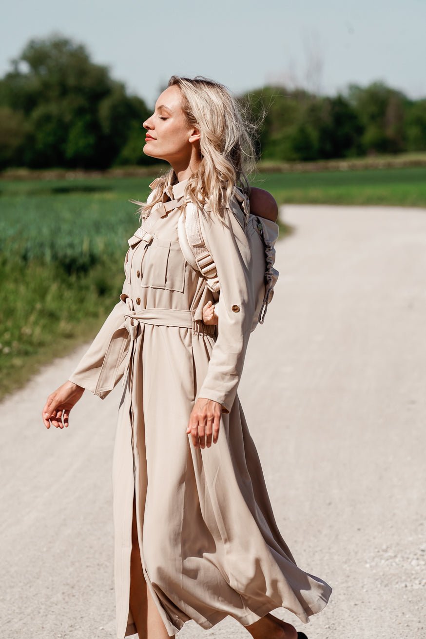 Avec notre porte-bébé KOKADI Onbu original, vous pouvez transporter votre bébé de l'âge tardif jusqu'à la fin de la période de portage facilement, rapidement et confortablement comme avec un sac à dos sur le dos - aucun nouage fastidieux et fastidieux n'est nécessaire !