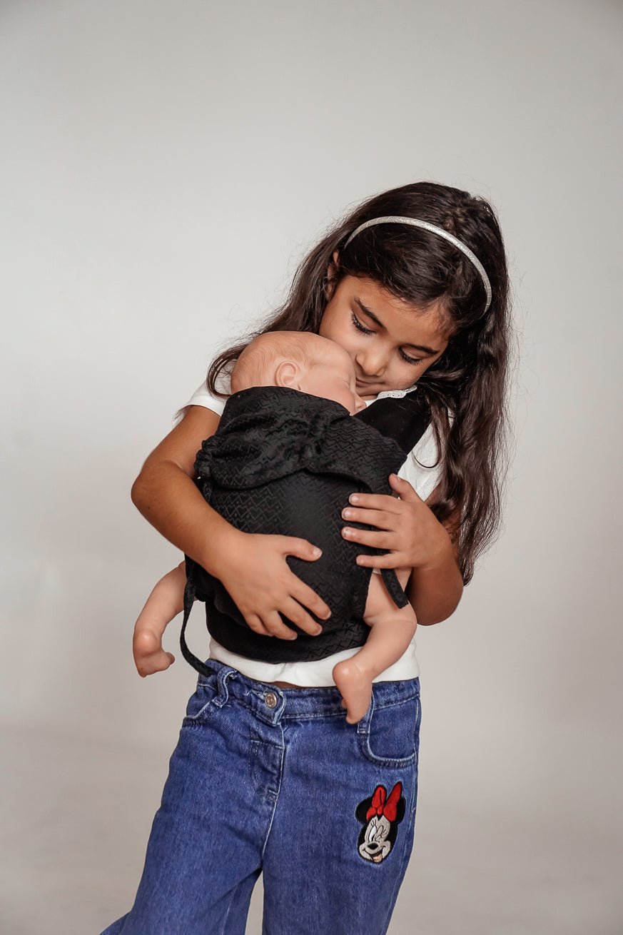 Wie beim Original ist der MiniFlip aus Tragetuchstoff gefertigt, in diesem Fall aus 100 % weicher Bio-Baumwolle im Design Heart2Heart Black Beauty. Die Träger lassen sich wirklich binden, der Hüftgurt wird geklettet – kindgerecht, aber echt.