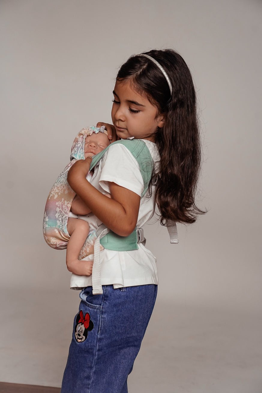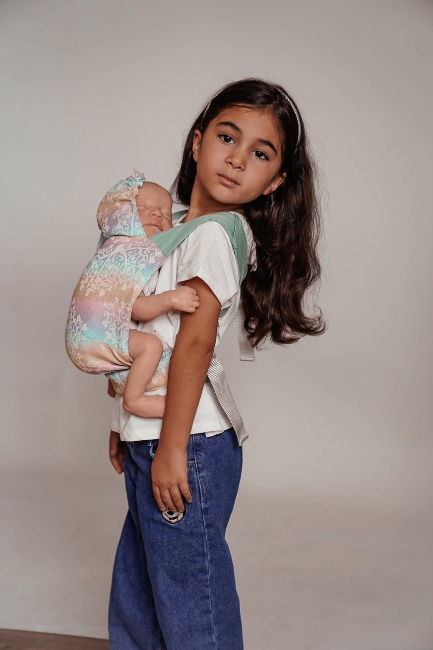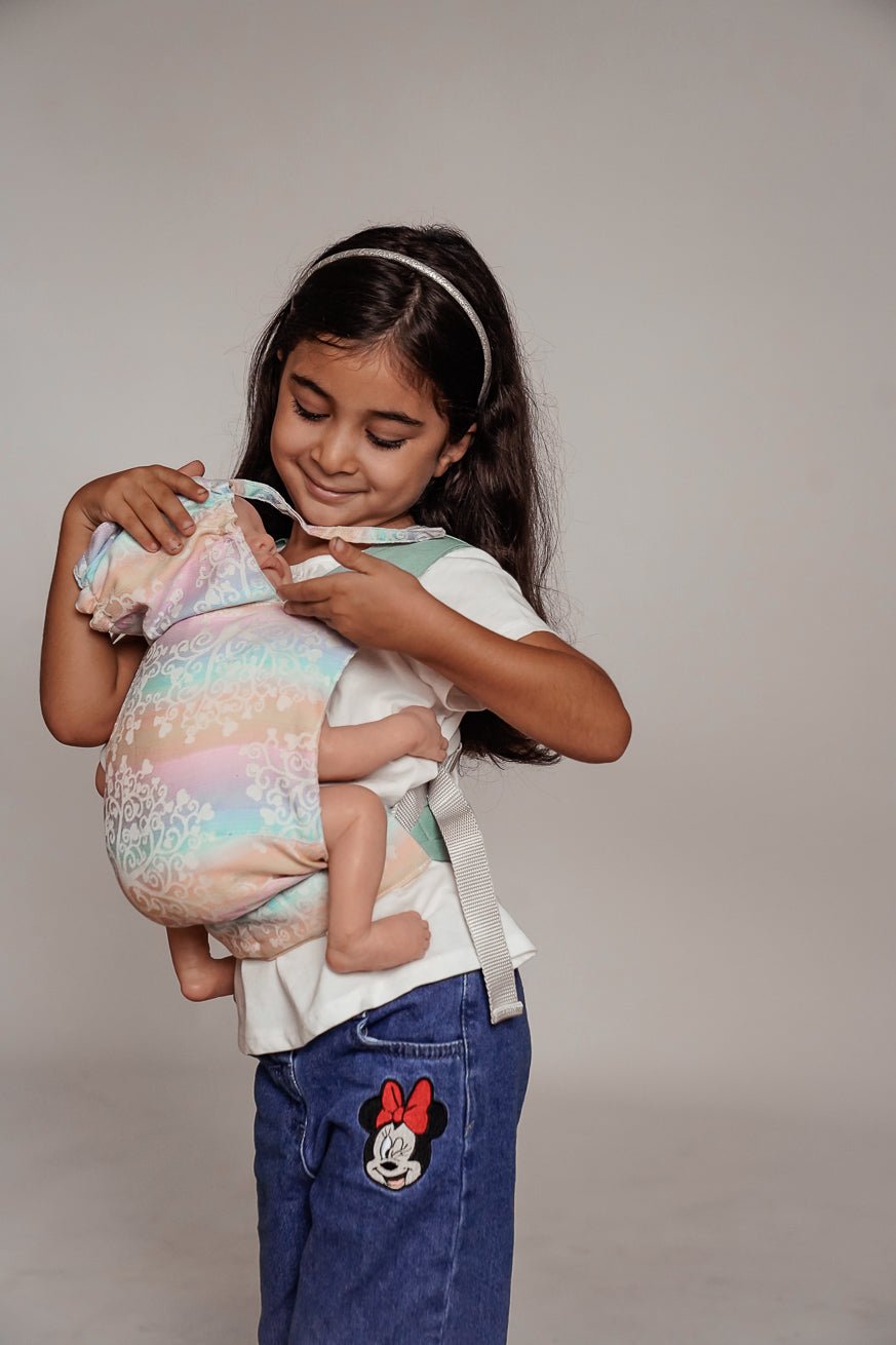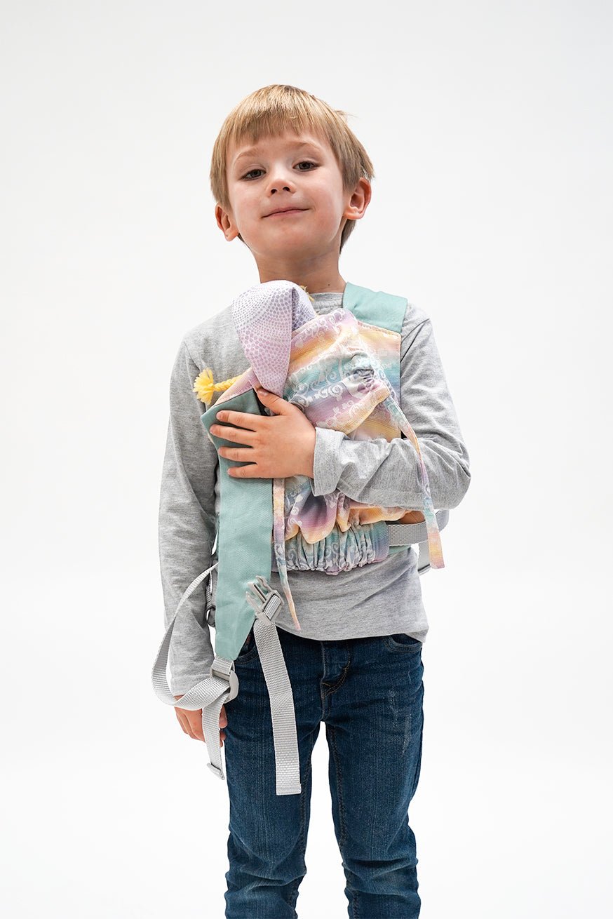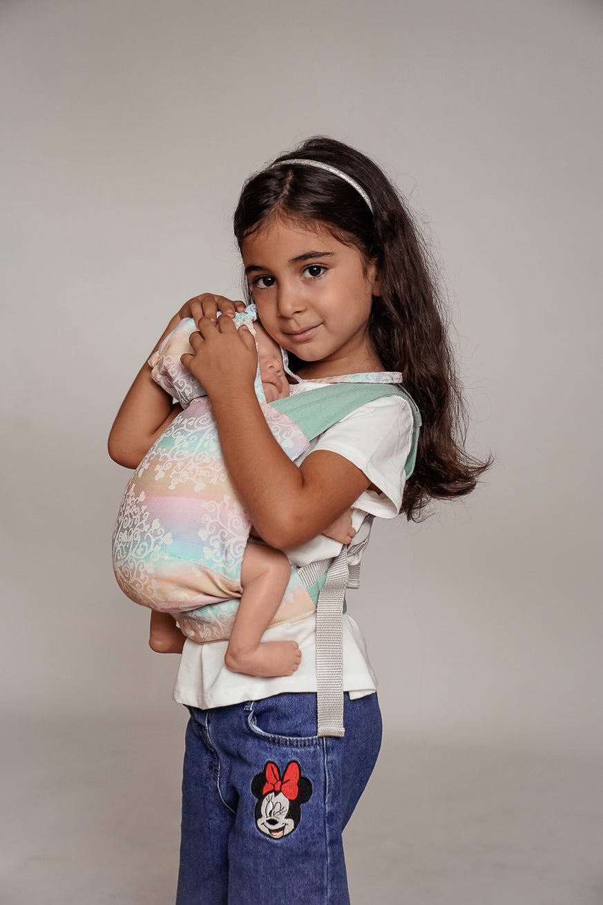 Comme tous nos produits de port, le panneau arrière est fait de transporteur tissé. La ceinture de hanche du mini flip est comme le Flip le gros réglable. La largeur du pont peut être réglée de manière glaciale avec le mini flip. La largeur du pont peut être réglée en continu et le jeu de l'enfant avec le mini flip. Les poupées et les jouets câlins jusqu'à 45 cm KOKADI Mini flip. Bien sûr, le Mini Flip a des instructions de liaison illustrées. Bridge 16 cm - 27 cm
